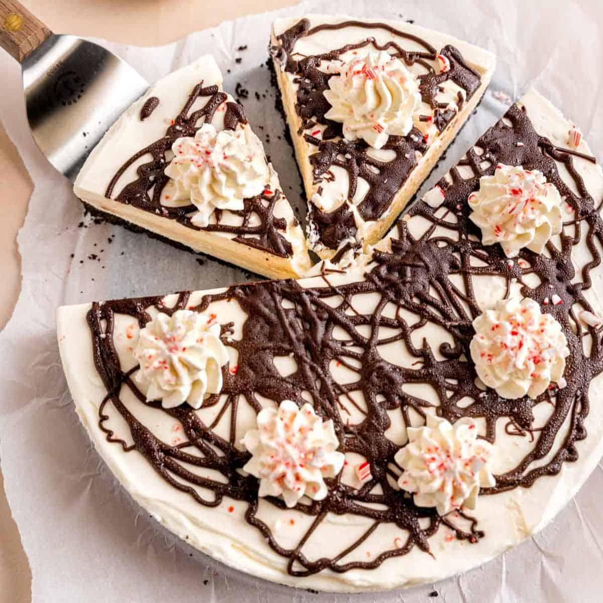 No bake peppermint cheesecake is the perfect holiday dessert! It starts with an Oreo crumb crust and is topped with peppermint flavored no-bake cheesecake filling that gets swirled with melted chocolate. Whip it up in less than 30 minutes and then let it chill overnight.