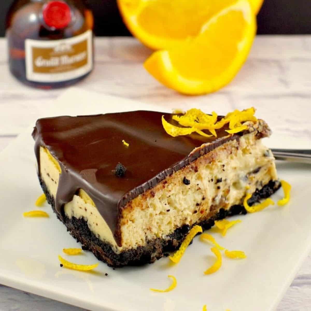 This baked Grand Marnier cheesecake with chocolate glaze is a rich and delicious combination of milk chocolate, dark chocolate, orange and Grand Marnier liqueur on a chocolate Oreo crust.