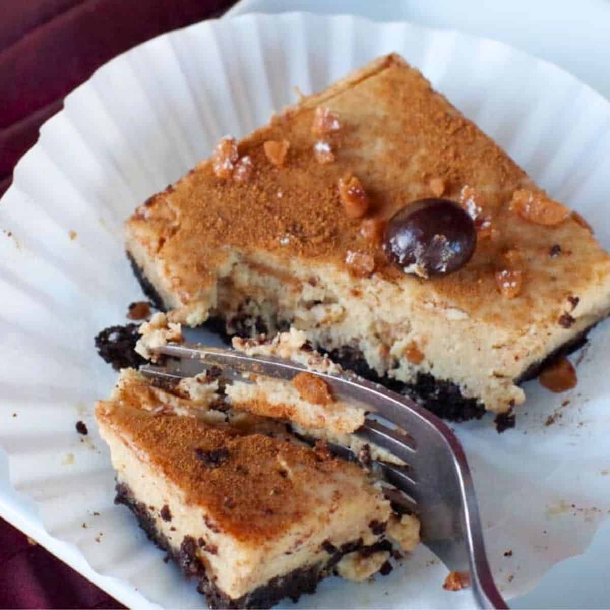 Christmas season is upon us and that means two wonderful things - eggnog and baking! These mocha eggnog cheesecake bars are a delicious combination of a creamy cheesecake filling with eggnog, toffee bits, coffee and cream cheese, baked over a scrumptious Oreo cookie crust.