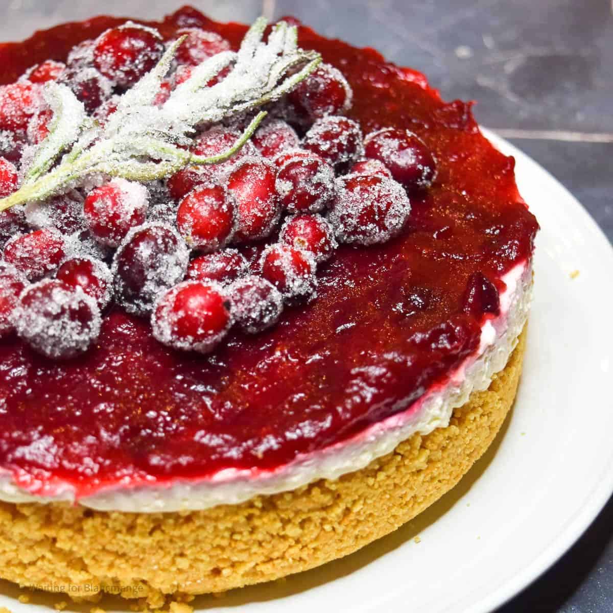 An easy no bake cranberry cheesecake recipe. This silky smooth vanilla cheesecake on a gingersnap cookie crust and topped with cranberry sauce and sugared cranberries will be a showstopping dessert for your table! Perfect for the holidays or a cranberry lover.