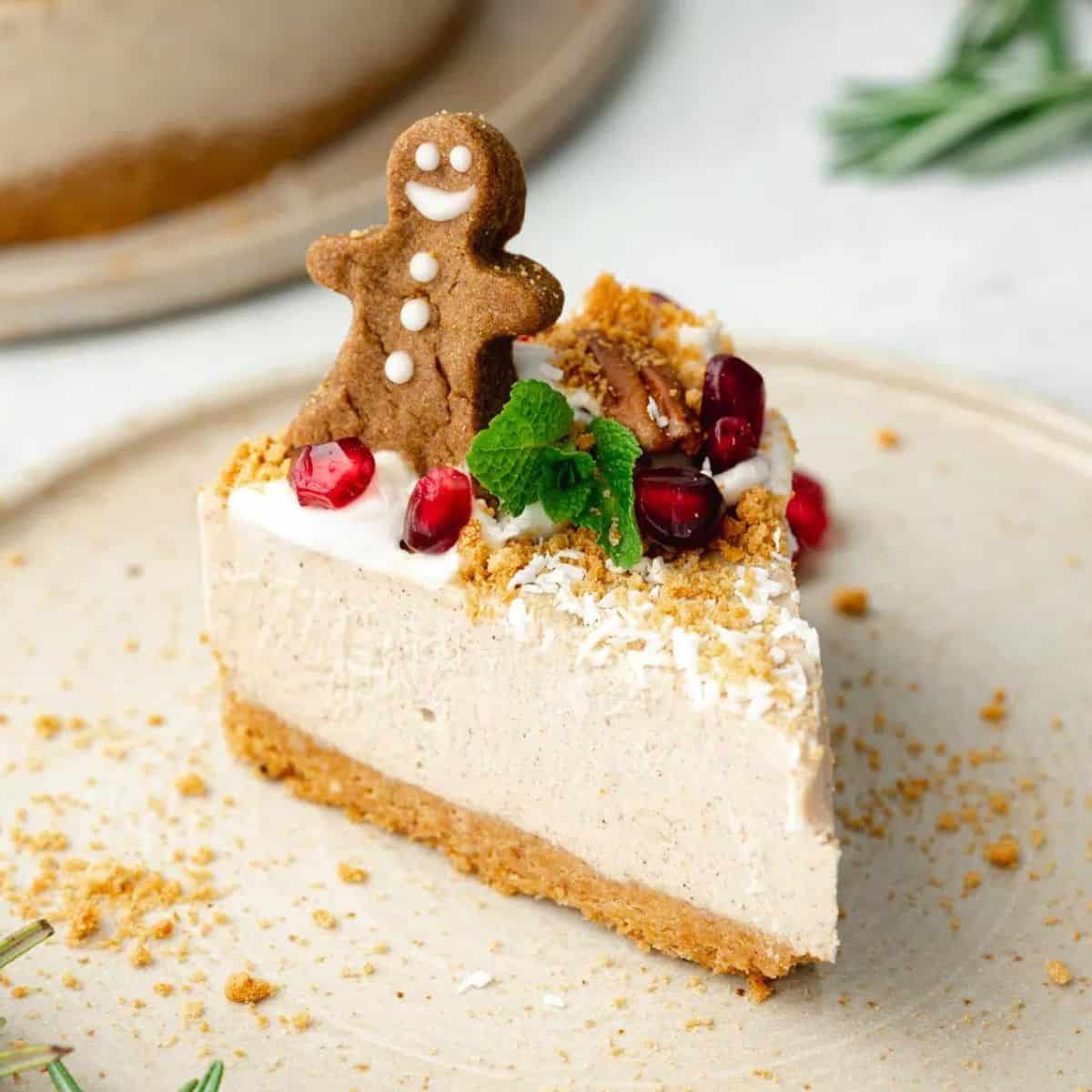 This delicious vegan gingerbread cheesecake is the perfect festive dessert for your holiday table. A creamy gingerbread filling on top of a no-bake ginger cookie crust. Best served with homemade vegan gingerbread cookies!