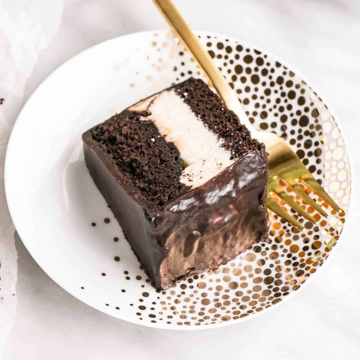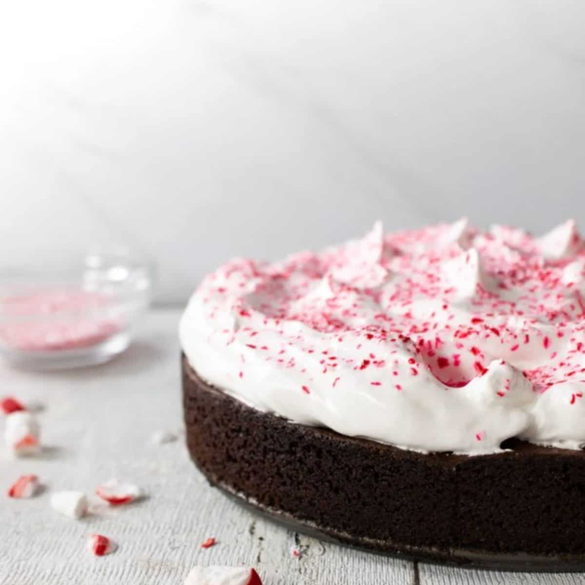 This cake is made from a thick and fudgy brownie, topped with a pillowy cloud of homemade peppermint marshmallow frosting.