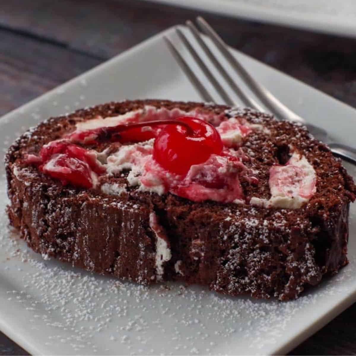 This black forest yule log cake features a timeless combination of cherries and whipped cream, encased within a delectable chocolate swiss roll cake, and generously covered with a velvety chocolate ganache for a luscious finish.