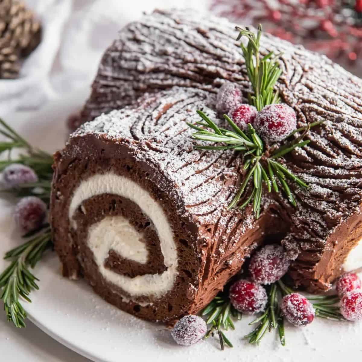Impress your guests this holiday season with a bûche de noël, also known as a yule log cake. The chocolate sponge cake has a mascarpone filling and chocolate ganache frosting that is absolutely delicious.