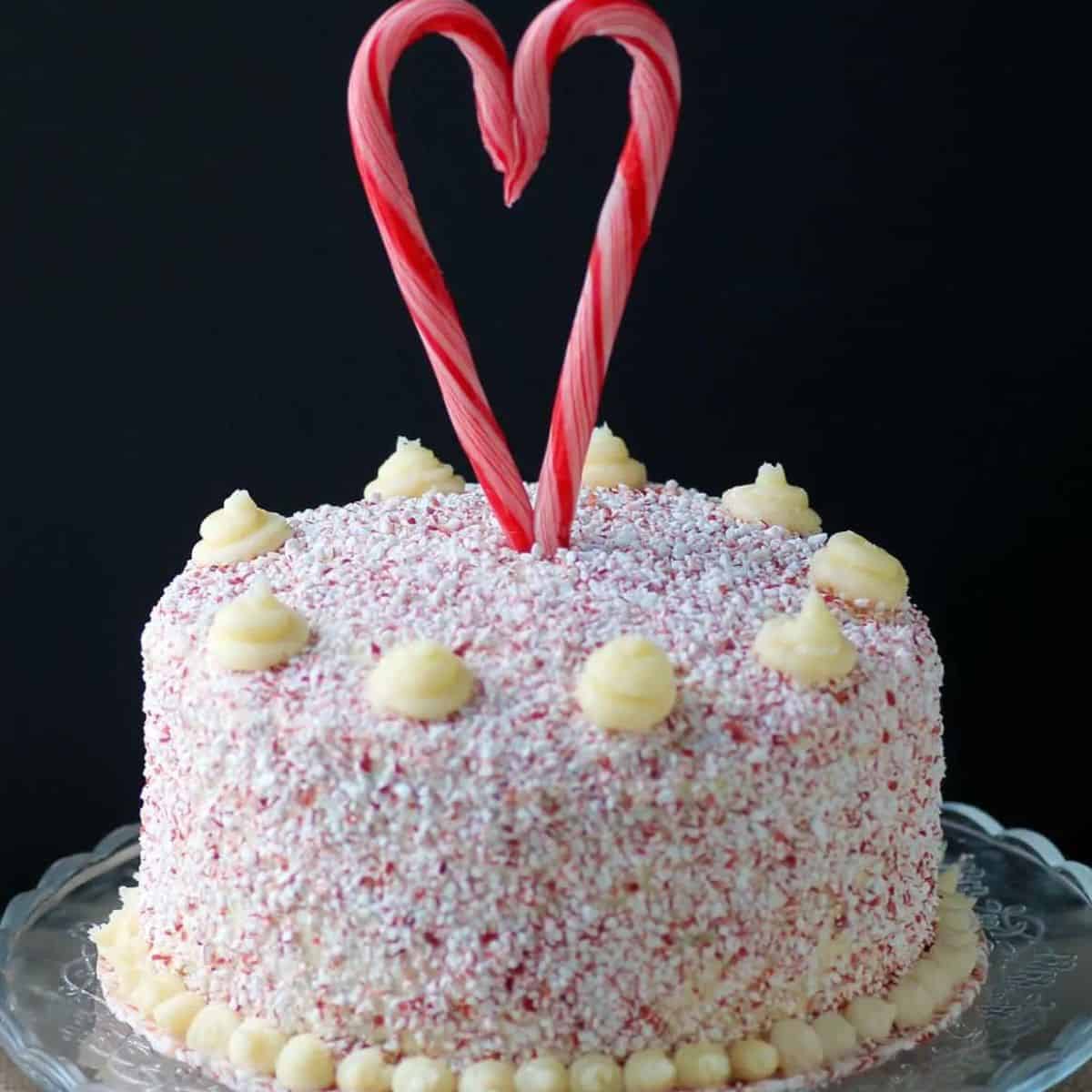 Christmas will be merrier with this candy cane cake. This recipe creates a delicious dark chocolate triple layer cake with white chocolate frosting that is covered in crushed candy canes.