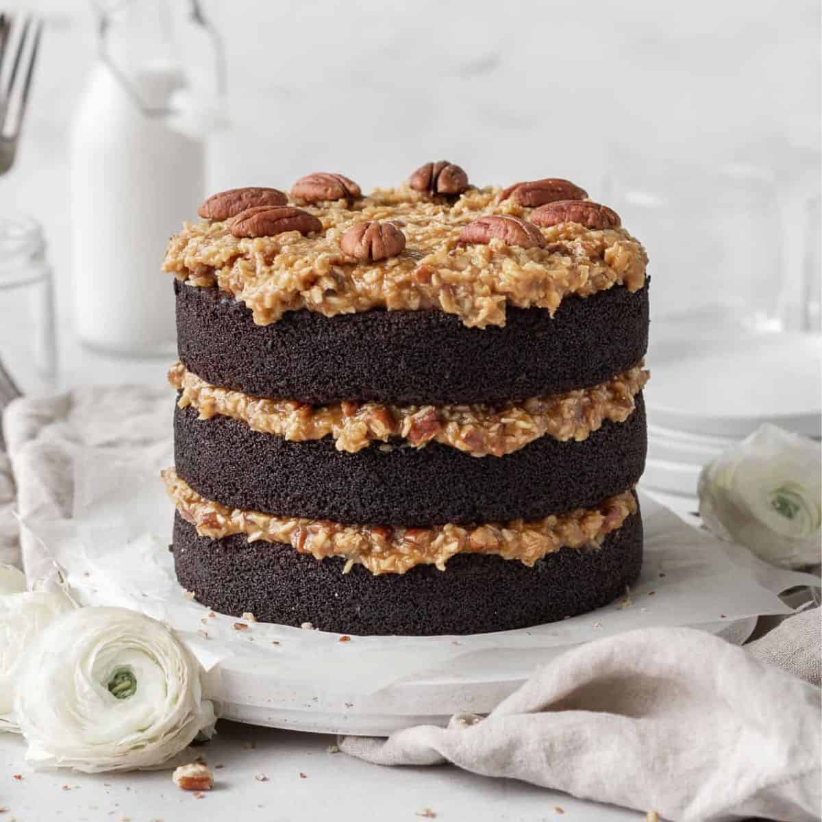 This gluten-free German chocolate cake has layers of moist chocolate cake and rich coconut pecan frosting that's decadent and delicious.
