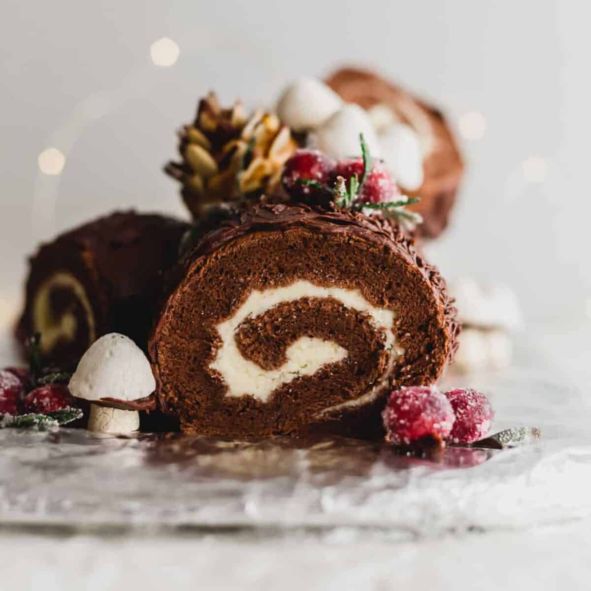 This recipe for Buche de Noel is a Christmas classic featuring a light chocolate Swiss roll cake decorated with edible and whimsical decorations.