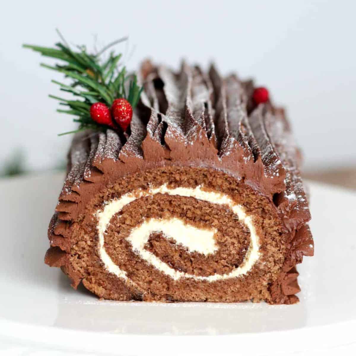 This Yule log is made without eggs or dairy so the whole family can enjoy it this Christmas. It's a chocolate roll cake filled with dairy-free vanilla buttercream, covered with chocolate ganache.