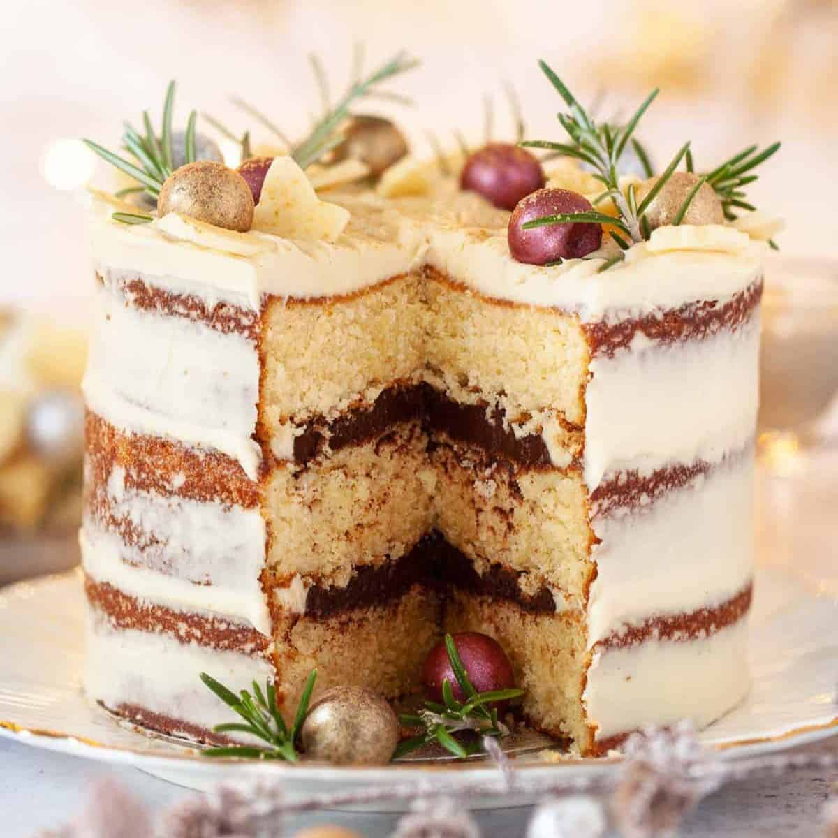 White chocolate sponge layers, hidden Baileys & chocolate ganache with a delicious Baileys and white chocolate frosting comes together in this beautiful Christmas cake that can easily stand in as the main dessert.