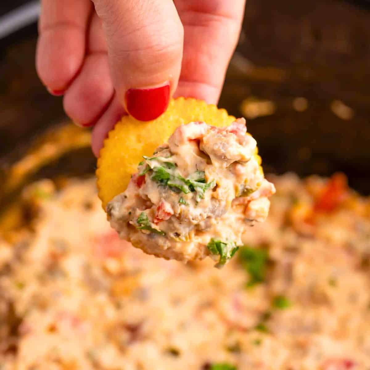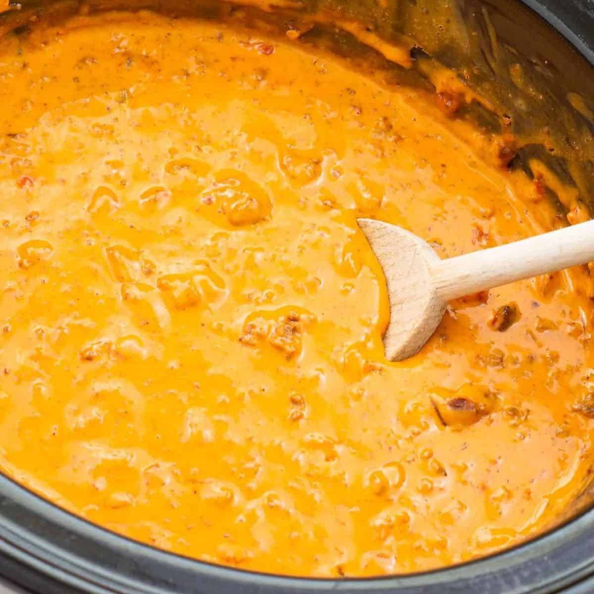 This slow cooker hamburger cheese dip is ooey, gooey, cheesy, beefy and full of flavor.