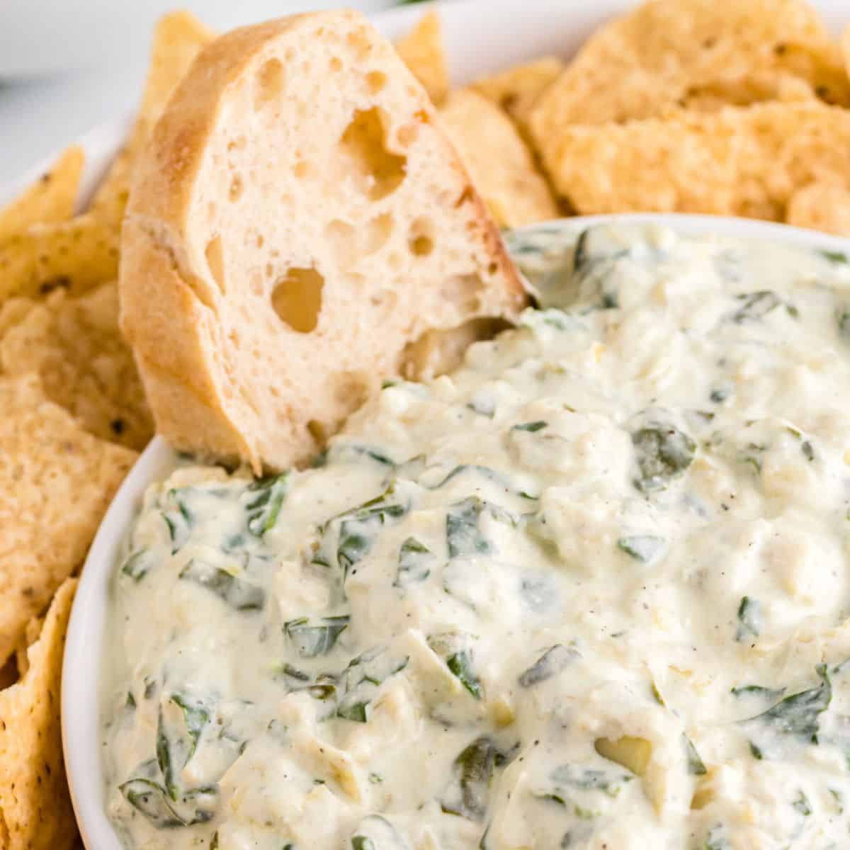 Crock pot spinach artichoke dip is creamy, cheesy, and so easy to make. Just add everything to your slow cooker and you’ll be rewarded with a hearty dip that’s perfect for a crowd!