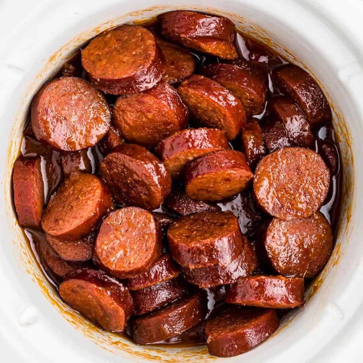 This four-ingredient slow cooker candied kielbasa sausage recipe is the perfect appetizer for a game day, a potluck, or a special dinner.