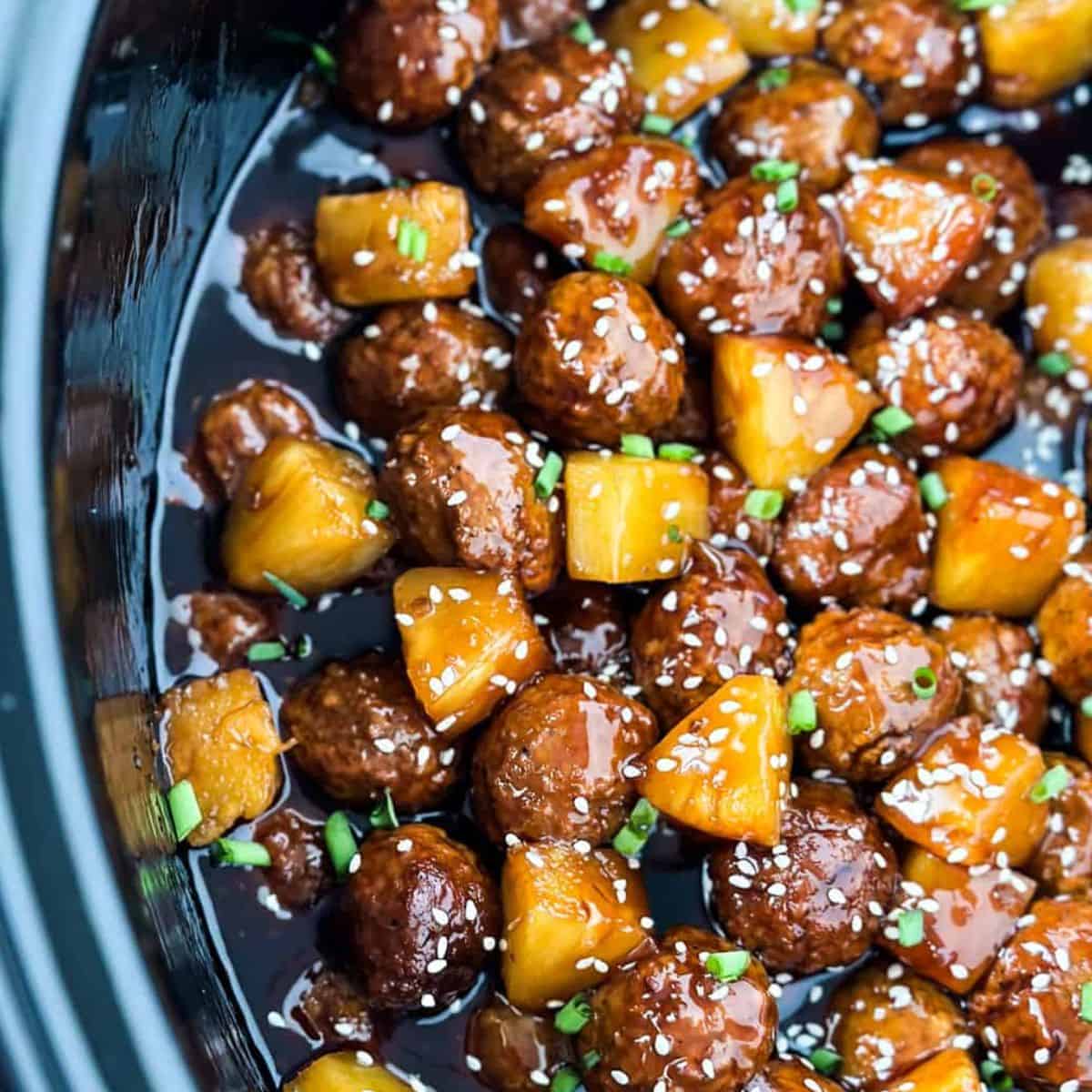 Slow cooker pineapple teriyaki meatballs are coated in a tangy teriyaki glaze with juicy pineapple chunks for the perfect balance of sweet and salty. Enjoy these meatballs as a party appetizer.