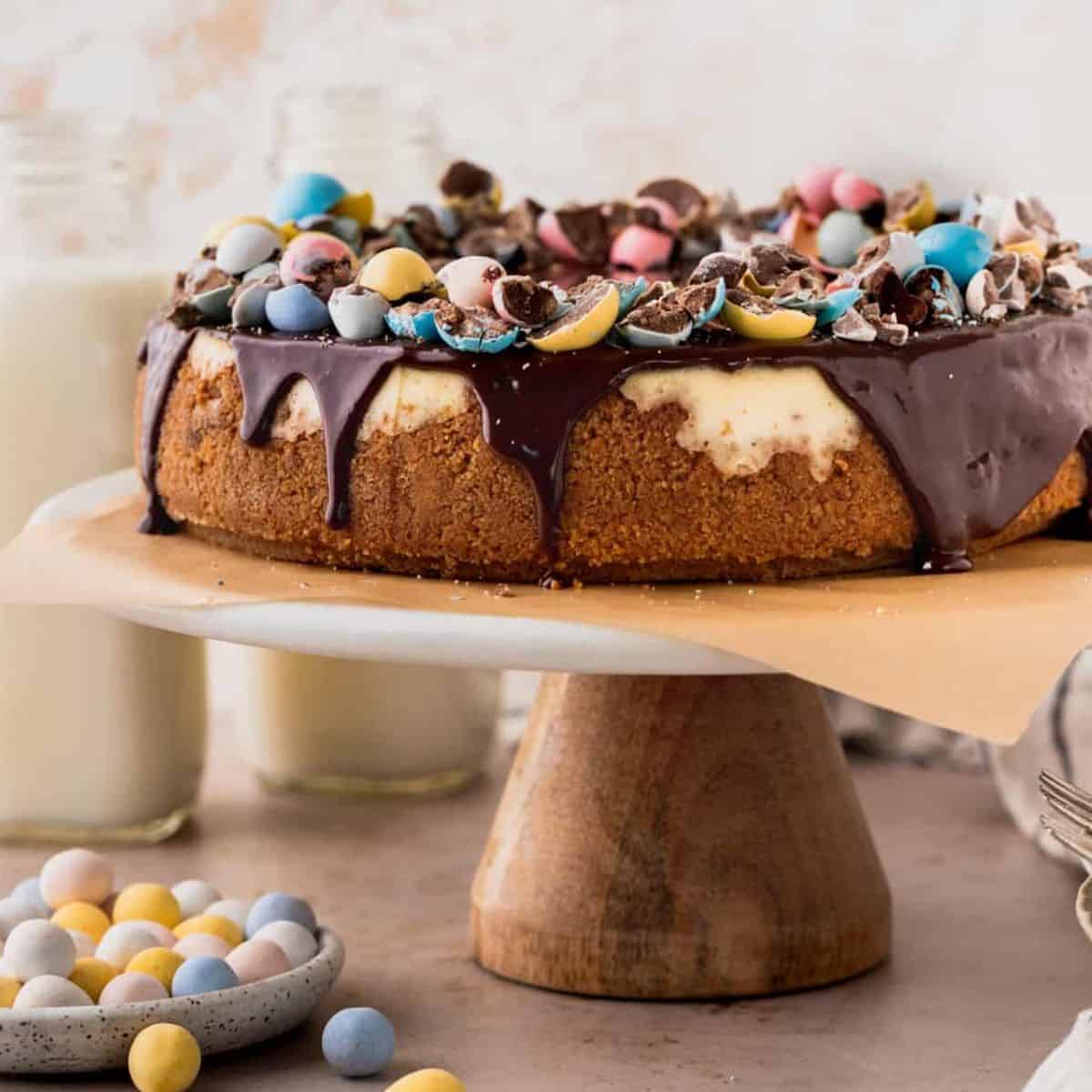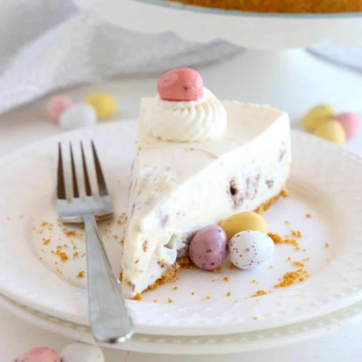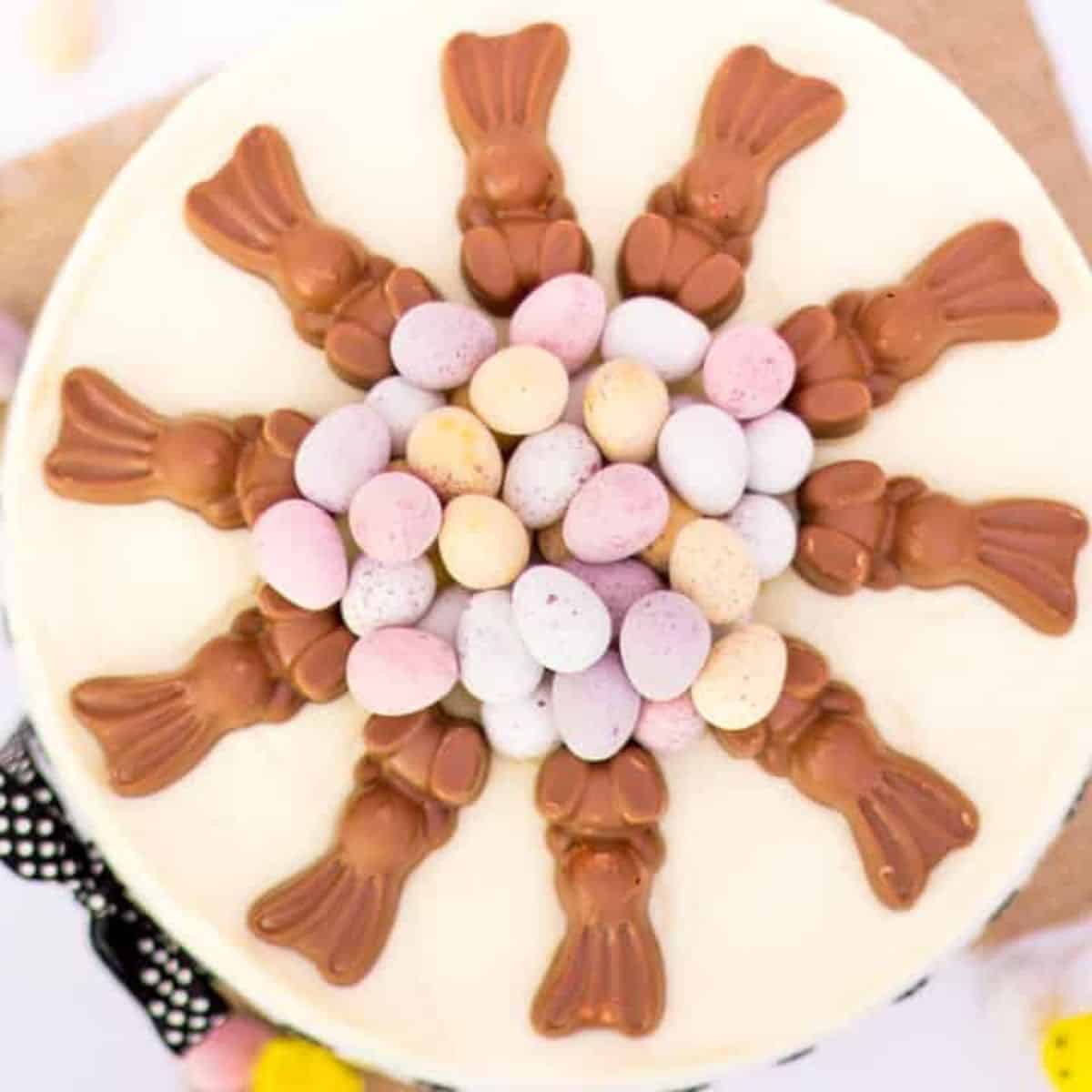 The cheesecake filling itself is loaded with white chocolate and the top is covered with mini Malteser bunnies and mini eggs.