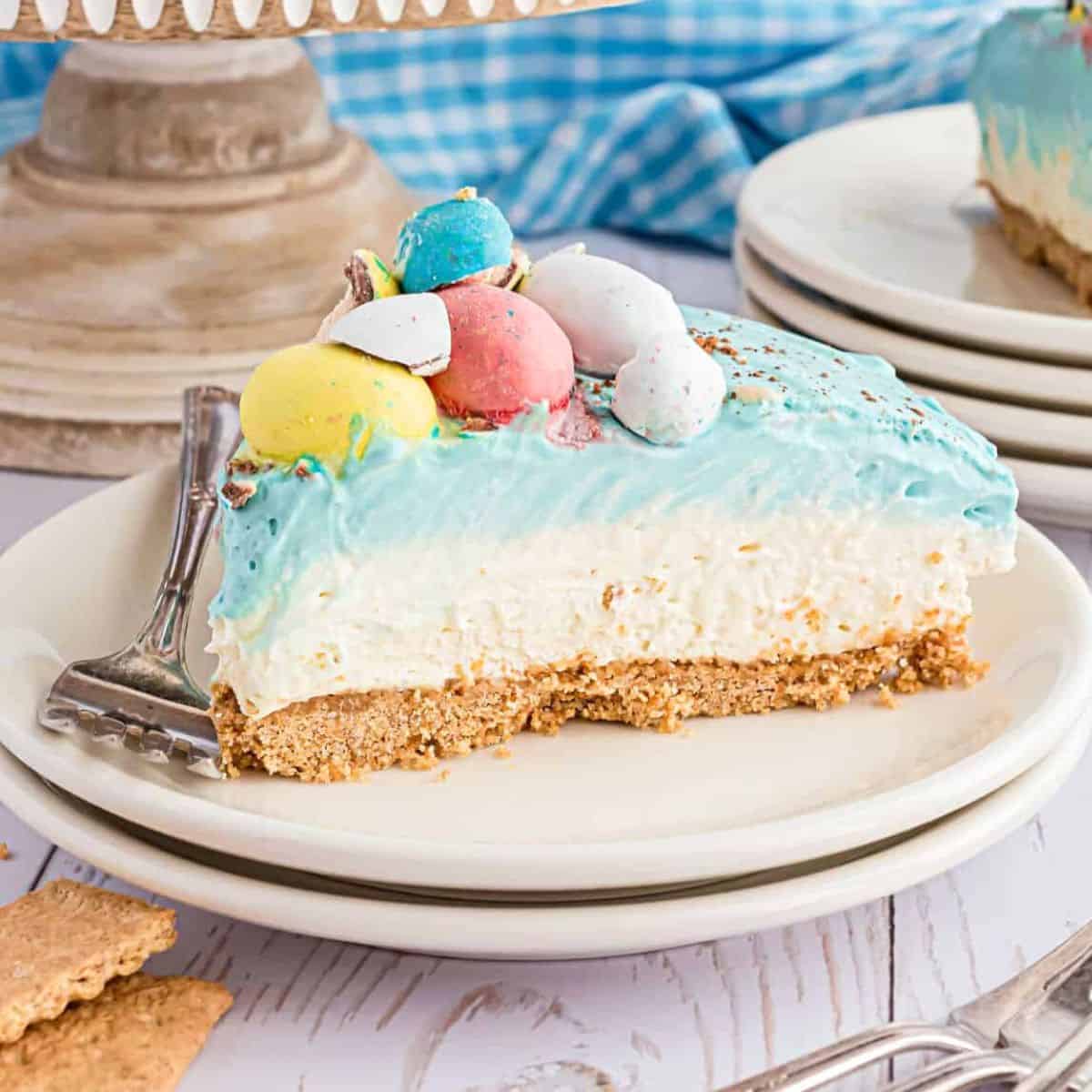 Turn heads with this vibrant Easter egg cheesecake at your holiday meal. A no-bake cheesecake is covered in whipped cream frosting and robin’s egg malt balls. The spring time colors make the creamy homemade cheesecake even better.
