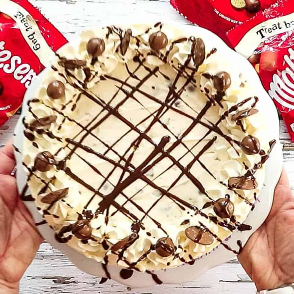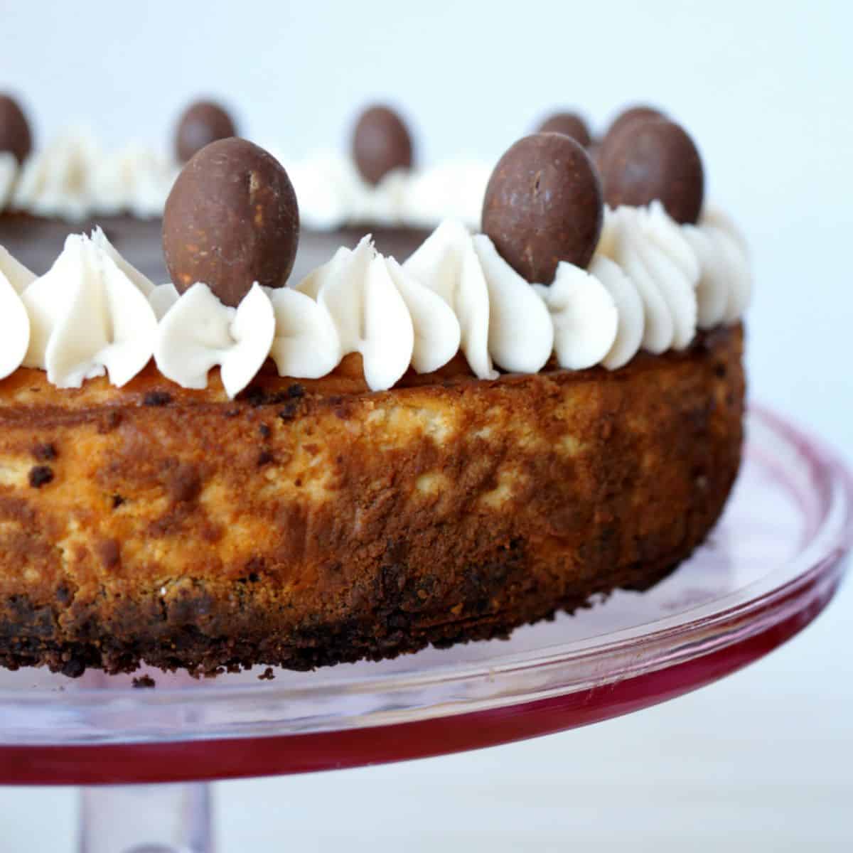 This chocolate Easter cheesecake has a buttery chocolate biscuit base and a creamy filling packed full of crushed chocolate Maltesers.