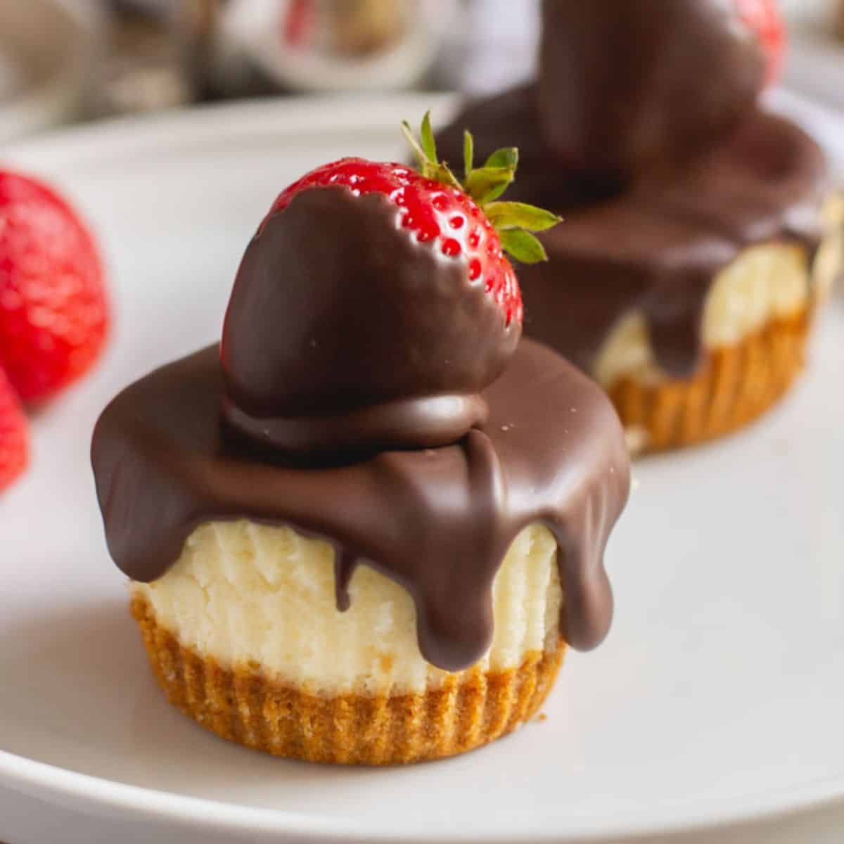 The sweet vanilla cream cheese flavor of these light and airy mini cheesecakes compliment the chocolate covered strawberries to make a dessert that not only looks gorgeous, but tastes wonderful.