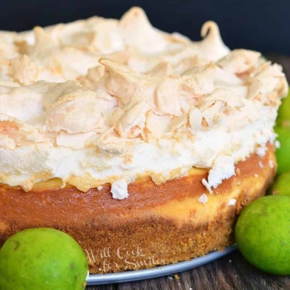 This best of both world's dessert features a layer of graham crust infused with key limes, followed by a smooth, creamy layer of cheesecake, then a layer of key lime pie, and finally a thick layer of sweet, light meringue on top.