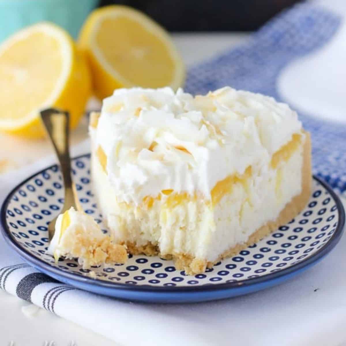 This no-bake lemon macaroon cheesecake is layered with golden oreos, coconut cheesecake, lemon curd and whipped cream.