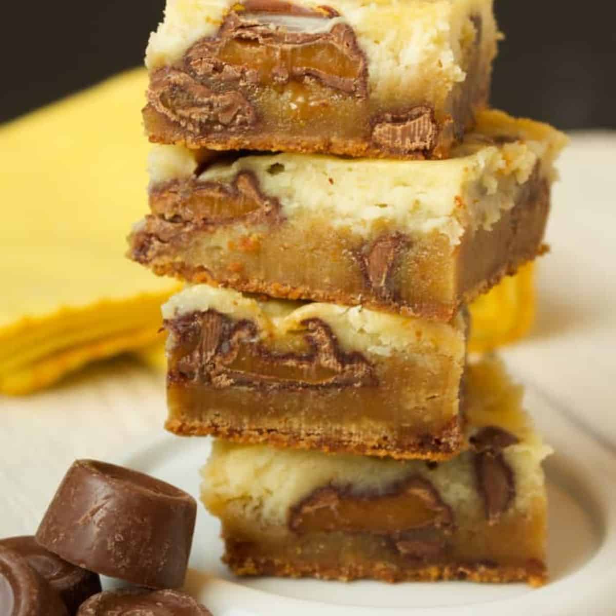 Your appetite for chocolate will be sated with this combination of cookie base, cheesecake topping and chocolate and caramel Rolos baked into each layer.