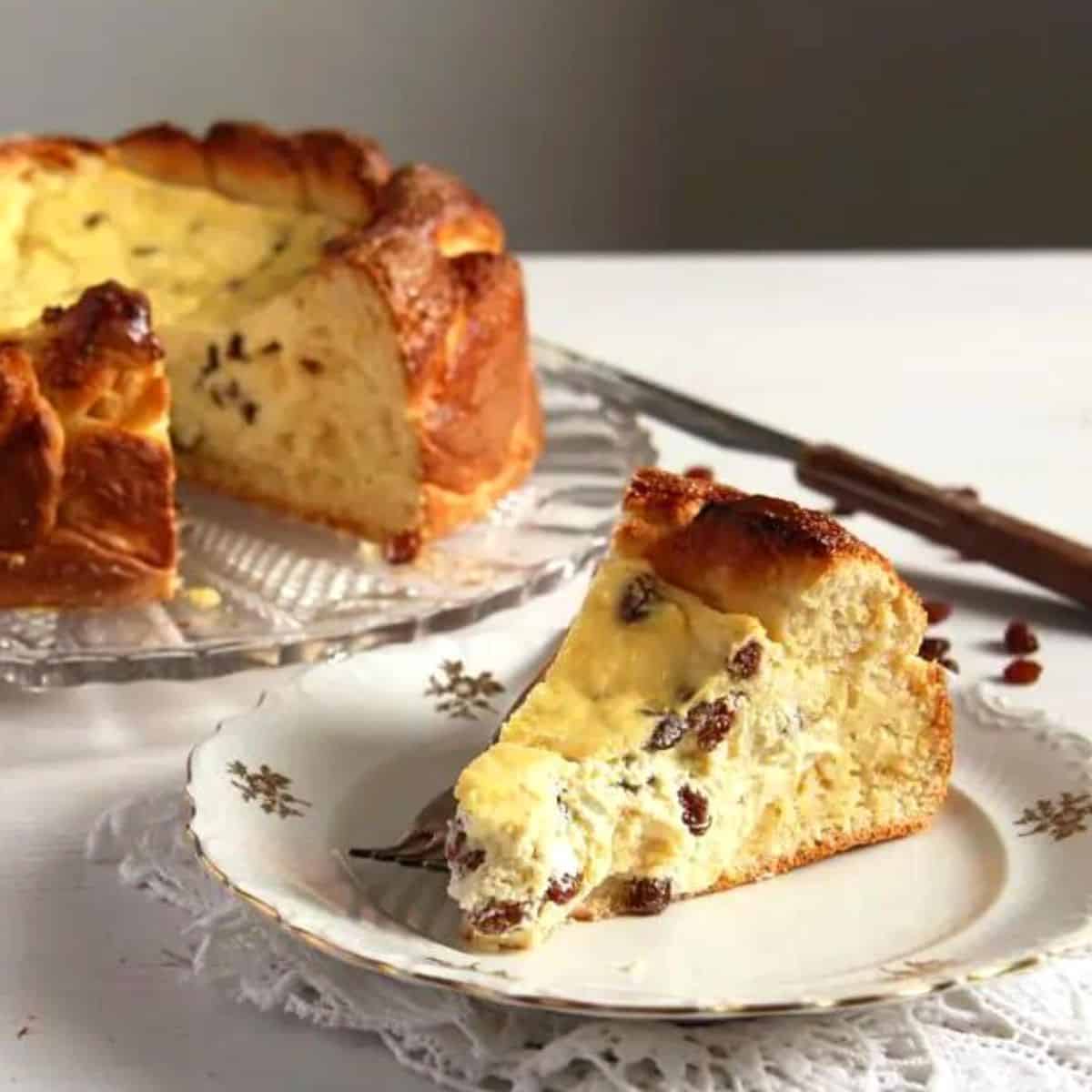 It's basically a typical cheesecake made with soft white “cow’s cheese" – branza de vaci - but untypically baked in a sweet bread case.