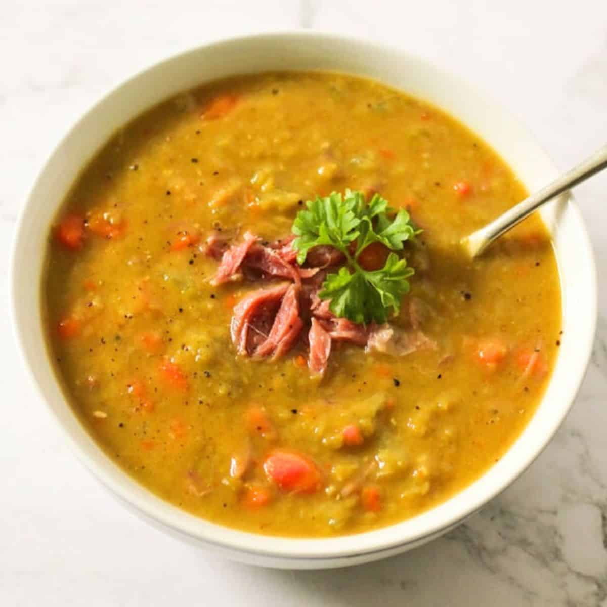 This leftover ham bone soup recipe combines ham on the bone with split peas for a comforting bowl of warm and tasty goodness.