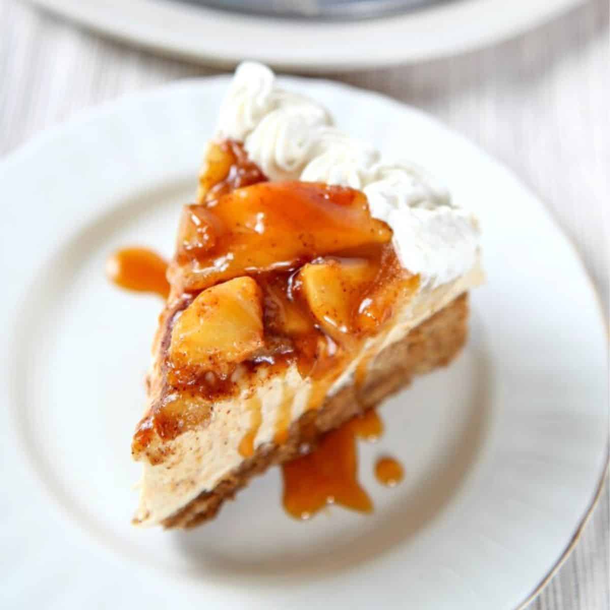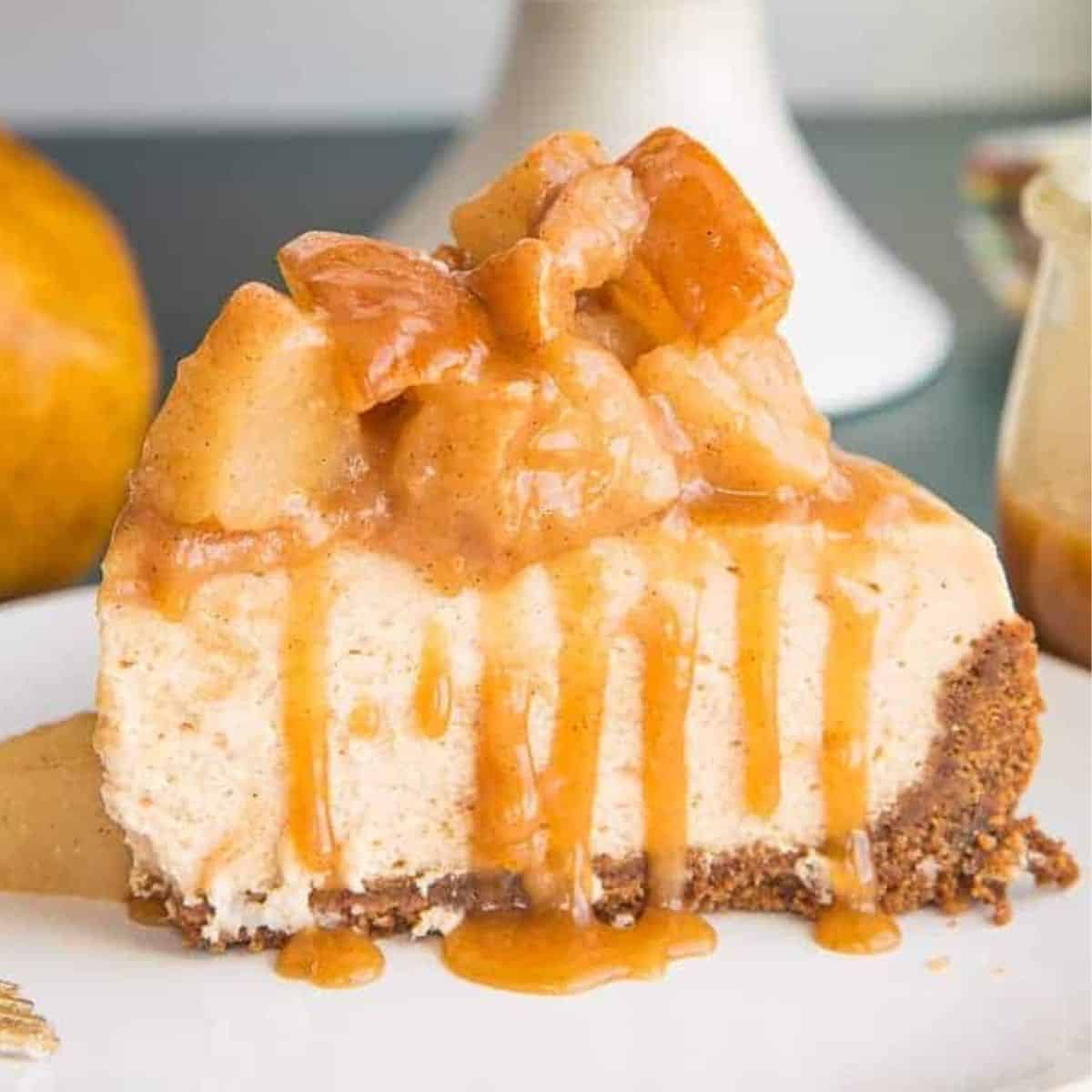 Creamy caramel cheesecake inside a cinnamon blondie crust topped with cinnamon apples and a decadent caramel drizzle. Delicious!