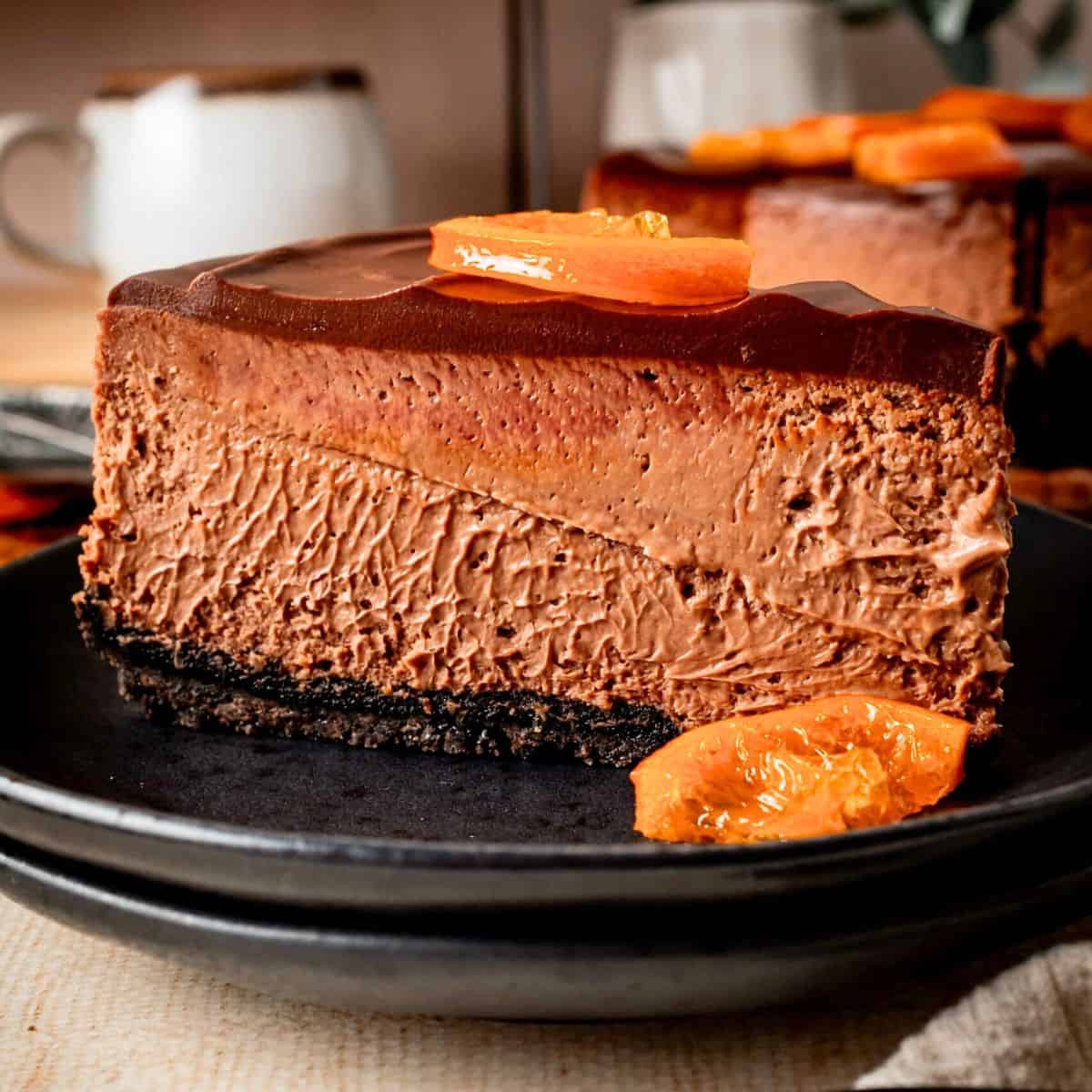 Intense chocolate meets fresh and citrusy orange in this decadently rich chocolate orange cheesecake! Featuring an Oreo cookie crumb crust, a velvety smooth chocolate orange filling and chocolate ganache topping, this cheesecake recipe is the perfect dessert for Thanksgiving.