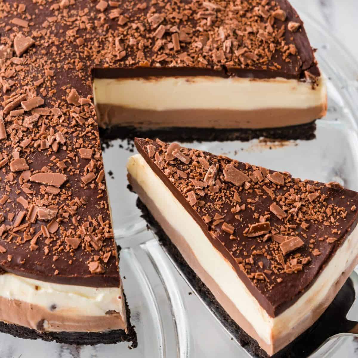 Indulge in the ultimate no-bake dessert with this layered chocolate cheesecake. This decadent treat combines a rich Oreo cookie base with luscious layers of semi-sweet and white chocolate cheesecake, all topped off with a smooth chocolate ganache.