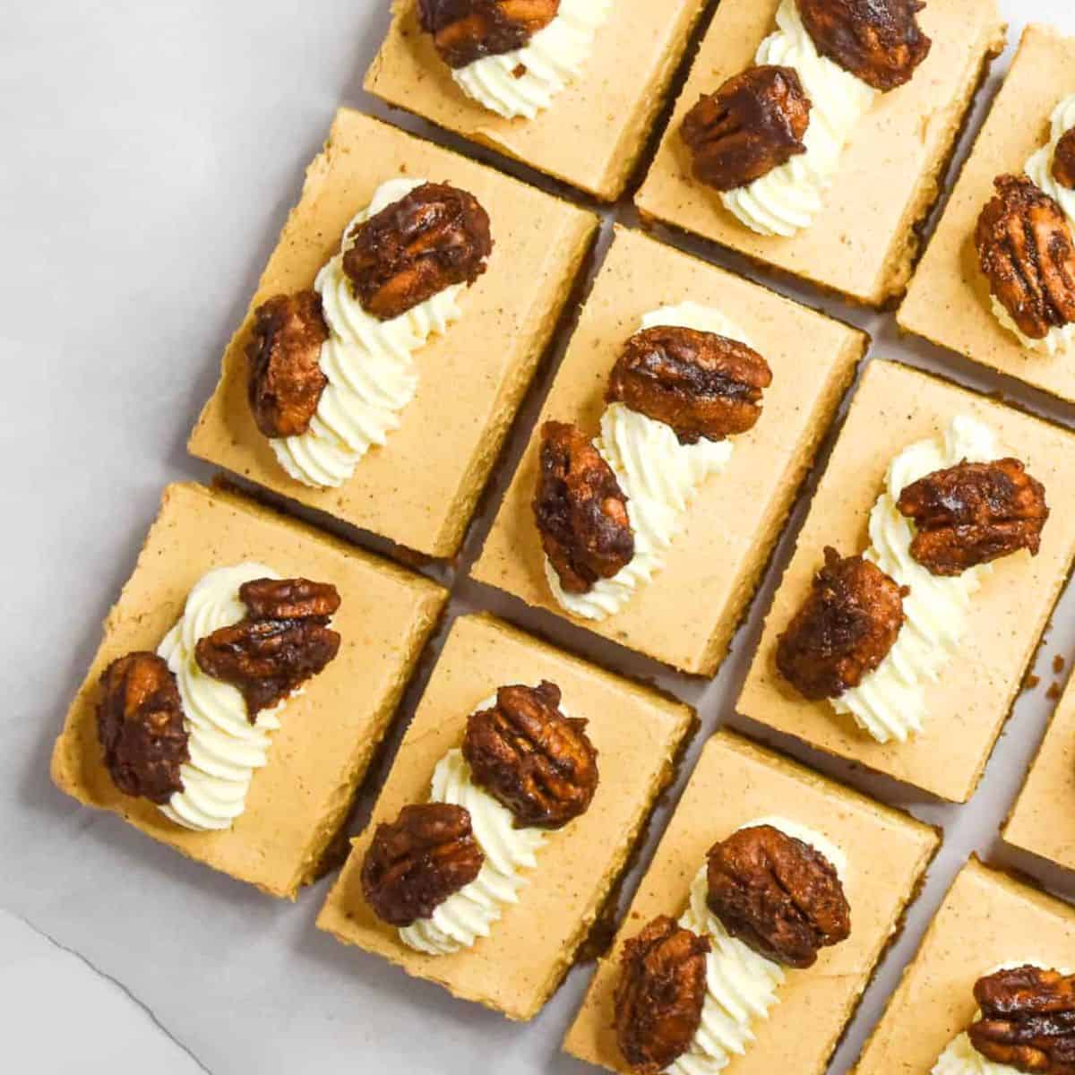 Looking for the best pumpkin pie cheesecake bars? Look no further! This easy recipe for no bake pumpkin cheesecake bars on a Biscoff biscuit base is topped with a quick vanilla whipped cream and homemade candied pecans.