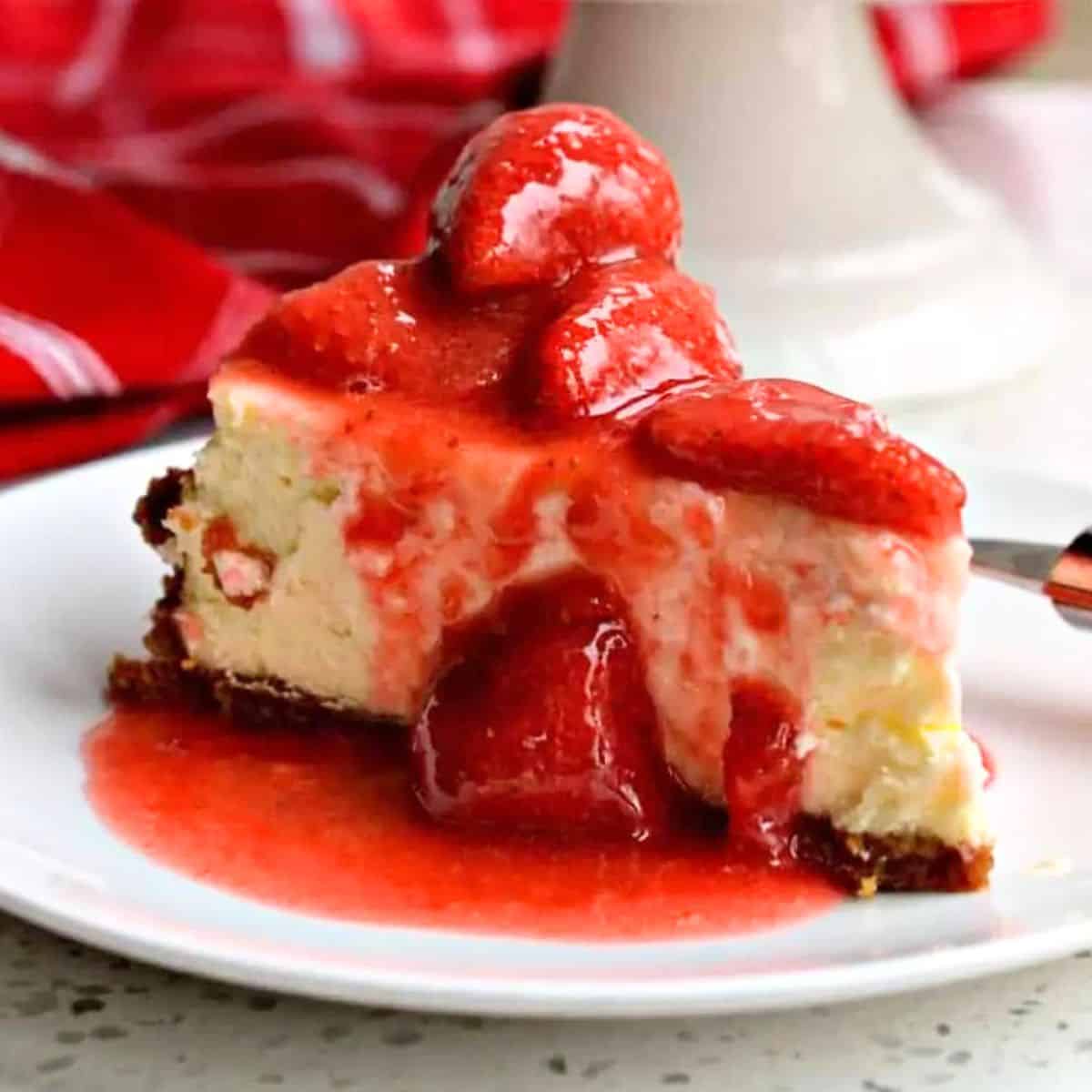 This delectable strawberry cheesecake is a cinch to make with a three-ingredient graham cracker crust and fresh strawberry sauce.