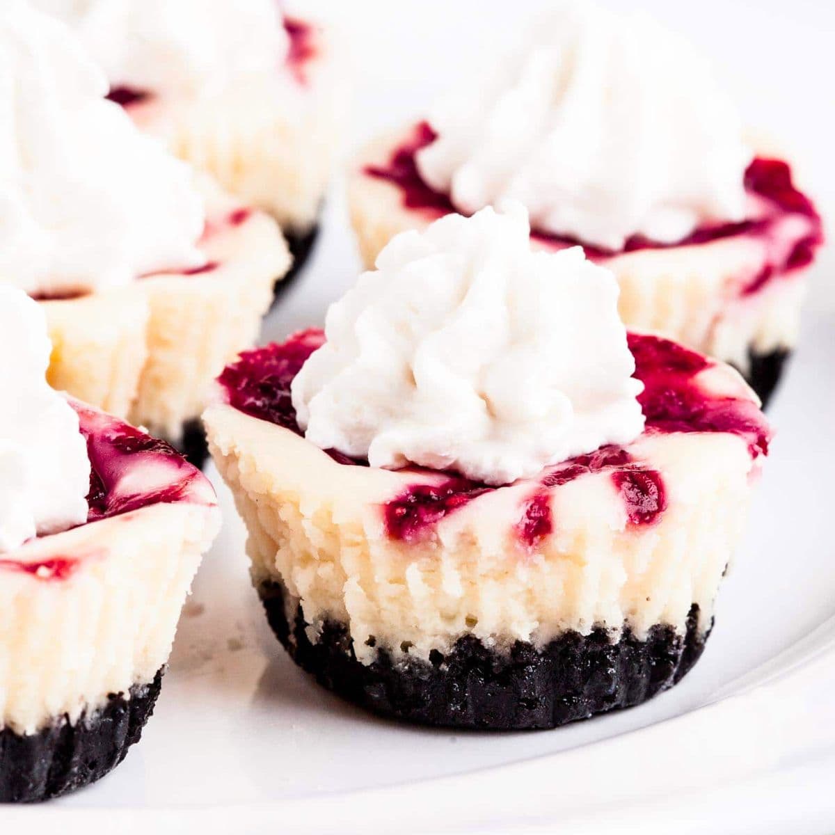 These white chocolate raspberry cheesecake bites are dense NY style. Luscious, rich, smooth, creamy cheesecakes strewn with real raspberry and topped with homemade whipped cream.