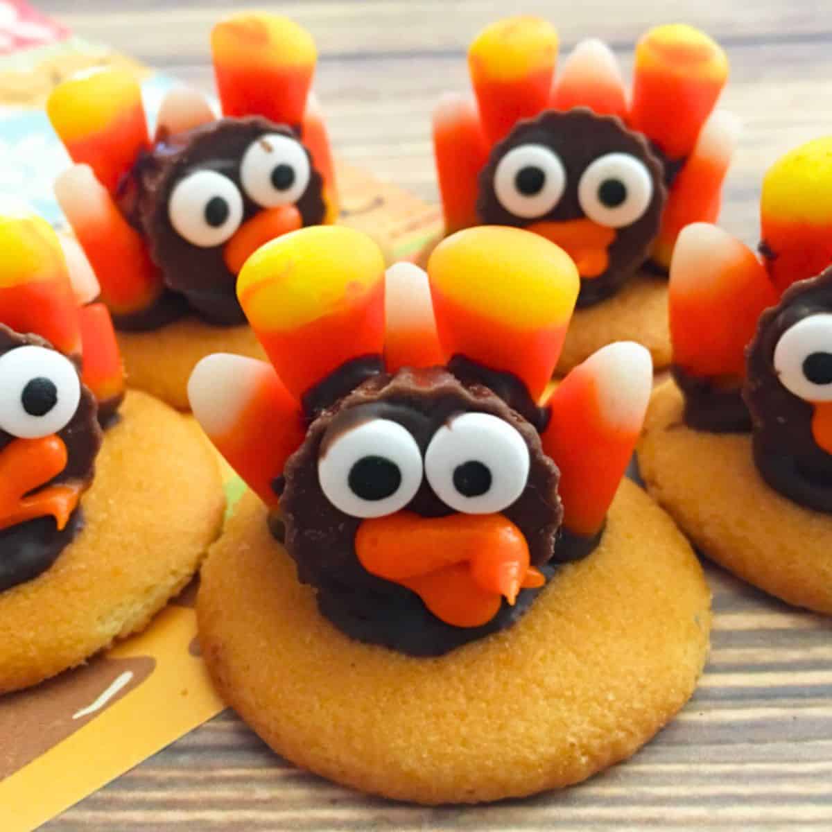 These adorable Thanksgiving Oreo turkey cookies are made with easy to get ingredients like peanut butter cups, candy corn and malted milk balls. They look like they might be hard to assemble, but they really do come together easily.