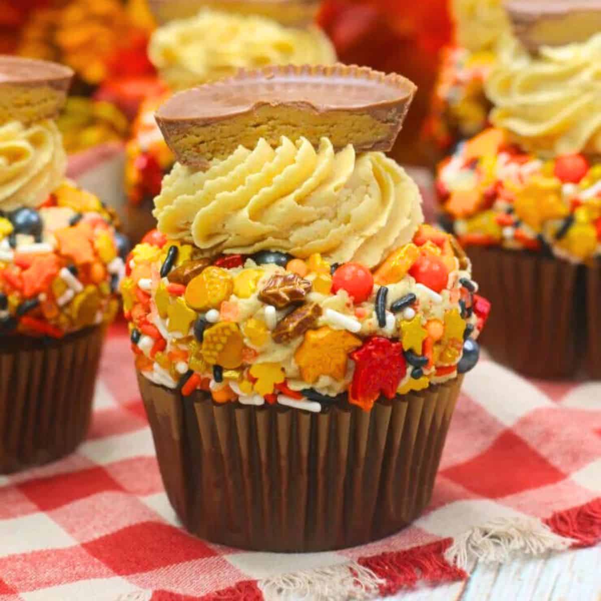 These peanut butter chocolate cupcakes feature a rich and fluffy chocolate cake topped with a luscious peanut butter frosting, all topped off with fall sprinkles and a Reese’s cup.