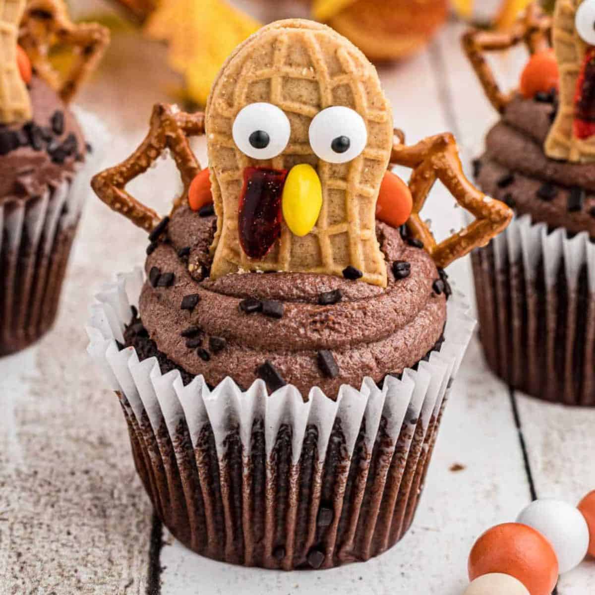 Cute nutter butter turkey cupcakes are a delicious way to dress up a cupcake for Thanksgiving.